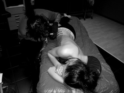 Nu är jag hemma, en sisådär 2,5-3 timmar senare! 2,5 timme med Björn Rosenström KONSTANT, hahah. Jag var så nervös så jag kände att jag höll på att bajsa på mig typ! Mina händer var så svettiga när jag låg på den där bänken och hörde hur han startade maskinen att det nästan rann och jag överdriver inte. Smärtan ska vi inte tala om, det var förjävligt! Självklart var det värt det. Man skrek inte men det kändes som att det gjorde FÖR ont för att skrika typ. Nålen som körde runt, fyfan, värst var det högst upp på revbenen och på höftbenet. Den gick på