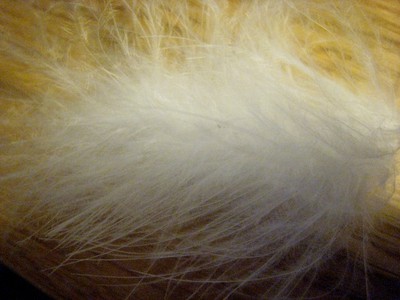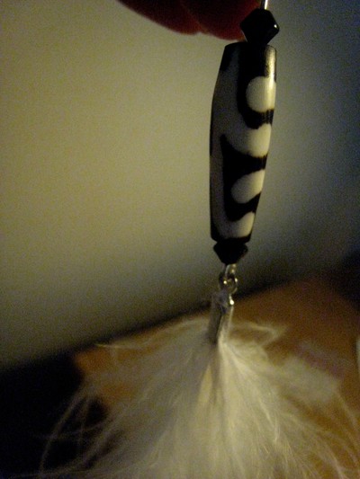Knip fast fjädrarna i den första grejen, vet inte vad den kallas men använd tången. Sätt på öglan och trä på de pärlor du vill ha.