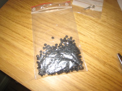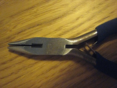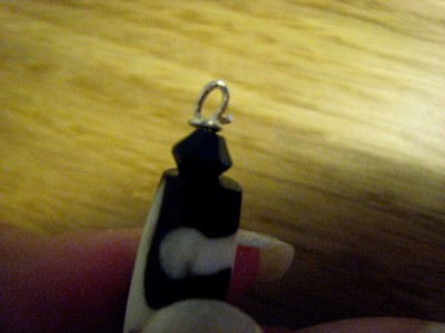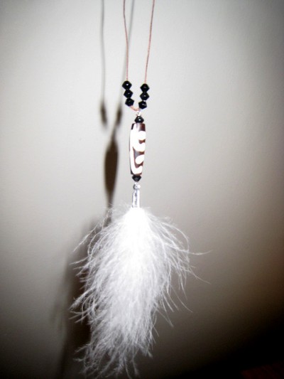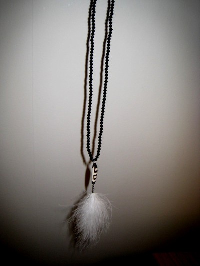 Knip fast fjädrarna i den första grejen, vet inte vad den kallas men använd tången. Sätt på öglan och trä på de pärlor du vill ha.